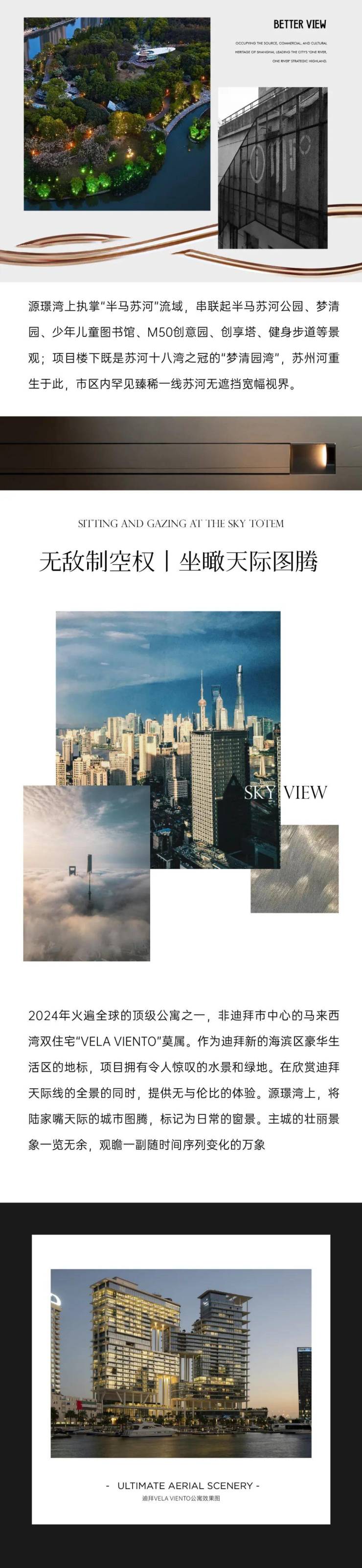 湾双住宅"VELA VIENTO"莫属。作为迪拜新的海滨区豪华生活区的地标,项目拥有令人惊叹的水景和绿地。在欣赏迪拜天际线的全景的同时,提供无与伦比的体验。源璟湾上,将陆家嘴天际的城市图腾,标记为日常的窗景。主城的壮丽景象一览无余,观瞻一副随时间序列变化的万象