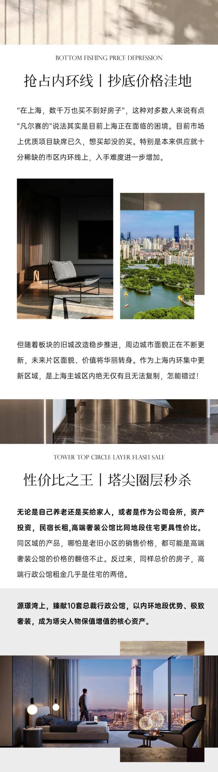 无论是自己养老还是买给家人,或者是作为公司会所,资产投资,民宿长租,高端奢装公馆比同地段住宅更具性价比。同区域的产品,哪怕是老旧小区的销售价格,都可能是高端奢装公馆的价格的翻倍不止。反过来,同样总价的房子,高端行政公馆租金几乎是住宅的两倍。源璟湾上,臻献10套总裁行政公馆,以内环地段优势、极致奢装,成为塔尖人物保值增值的核心资产。