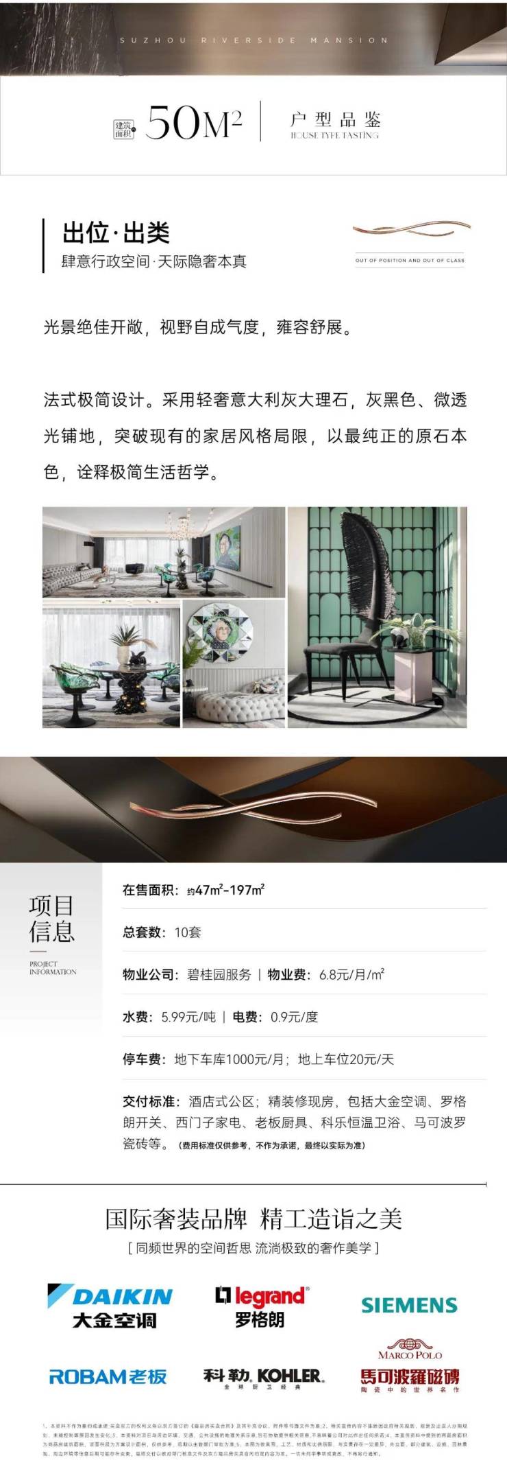 交付标准:酒店式公区;精装修现房,包括大金空调、罗格朗开关、西门子家电、老板厨具、科乐恒温卫浴、马可波罗瓷砖等。 (费用标准仅供参考,不作为承诺,最终以实际为准)