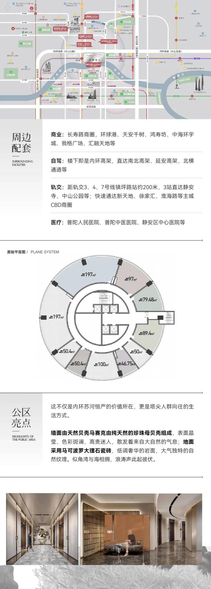 轨交:距轨交3、4、7号线镇坪路站约200米,3站直达静安寺、中山公园等;快速通达新天地、徐家汇、淮海路等主城