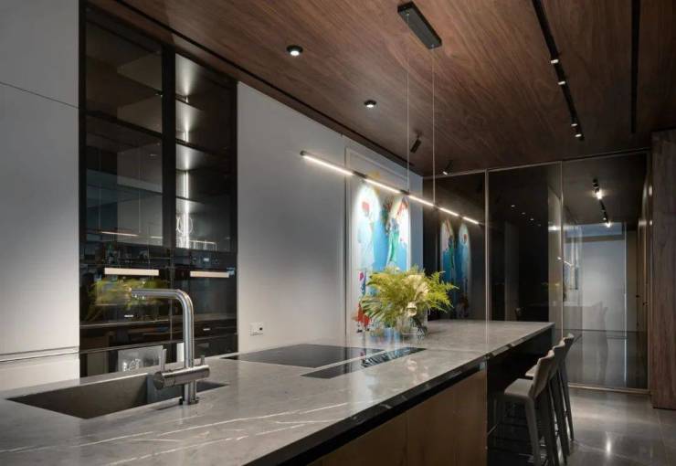 大大的空间,视觉感强烈,移动的玻璃门把客厅和厨房餐厅隔开,中央岛台和餐厅一体,线条简单,原木色天花和光线烘托出强烈的戏剧感。