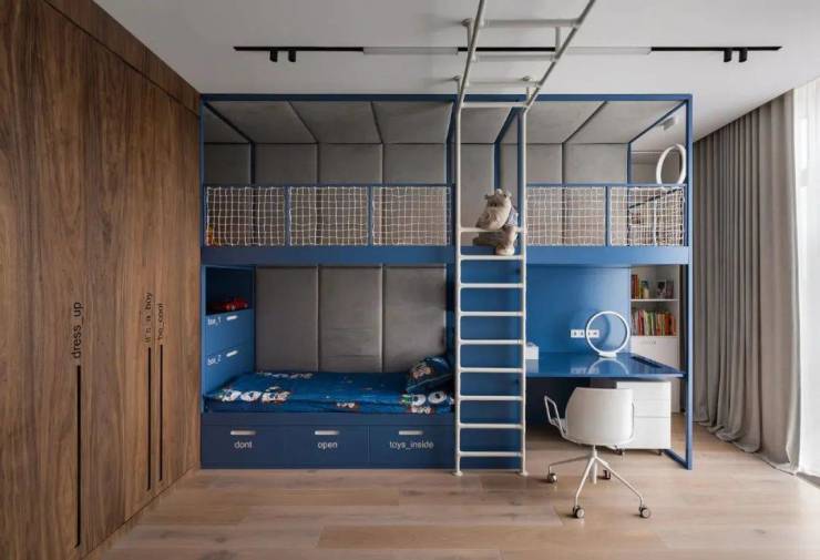 男孩房在主色调的基础上增添了蓝色用以装饰,用色彩传递情感,各种运动器材满足男孩的好动天性。