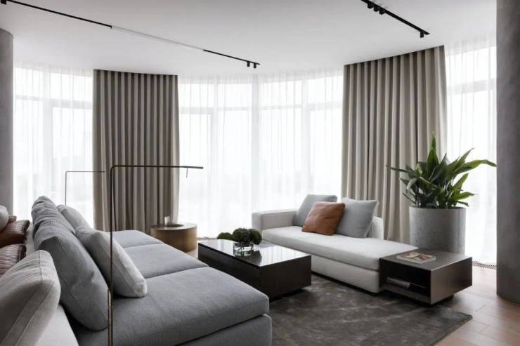 由设计师Artur Sharf,Artem Zverev,Alesia Riamova,Anya Tarabanova,Gleb Brizhanov共同设计,客厅以灰白色为主,与金属材质搭配,加入工业风元素,使得格调满满的,纯粹而惊艳。