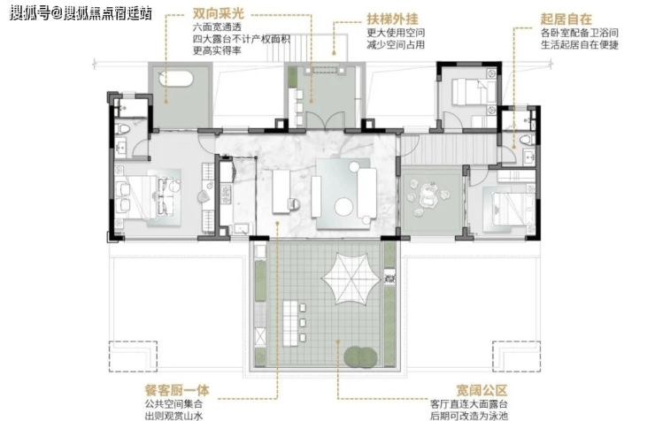 试着向山湖推开一扇窗,赠送面积约80㎡,客厅直连约6.6米超大景观露台,后期可改造为泳池,四大露台实得实享。四个露台可充分匹配全家喜好,烧烤、品茶、看书、玩乐,甚至约上好友在泳池中与山湖共举一杯……使得人们不论在卧室或是在厨房,都能享受到清晨的第一缕阳光和窗外的湖与山。