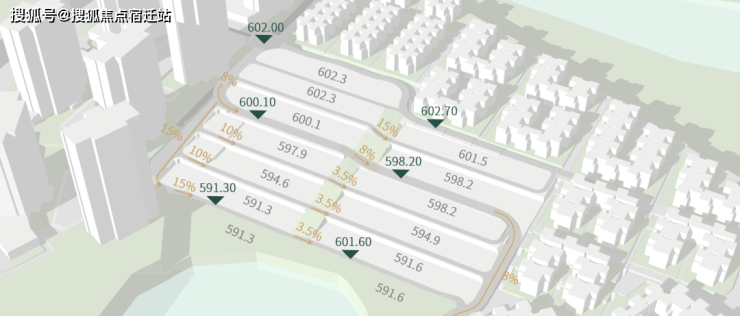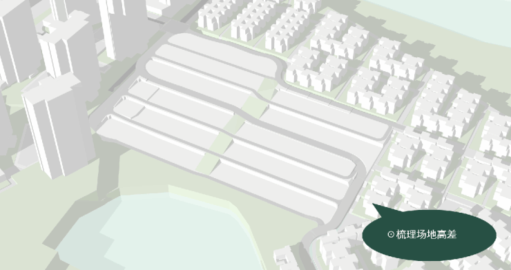 设计以南向湖景资源利用最大化为第一触笔,首先处理场地高差,西侧道路解决主要高差,坡度控制在15%;东西向基本拉平,保证住宅入口基本无坡道。