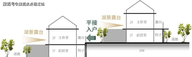 缓坡建筑遵循山的脉络,逐排抬高,保留约3米高差,层层退台,极大程度保留最佳观湖视野。上叠露台观景上,布局避开前排住户的坡屋顶,实现极致的观湖景观视野。上叠入户方式上,后排住户与前排住户有3.3米的高差,后排住户二层的露台可以避开前排住户的坡屋顶,拥有良好的观湖景观视野。同时前排二层上叠住户可实现平接入户。