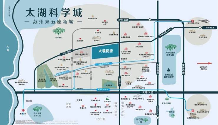 生态景观:12座山体、34条河道湖泊,3个5A景区苏州太湖国家湿地公园、苏州太湖国家旅游度假区、江苏大阳山国家森林公园,同时5640公顷绿地资源、10平方公里大阳山生态坐标、25公里太湖岸线