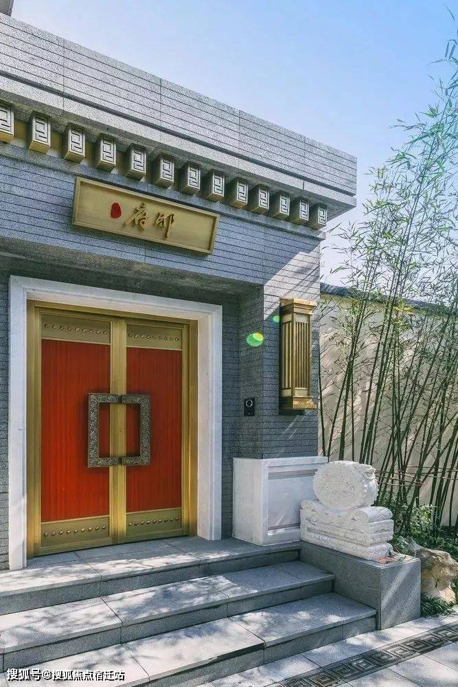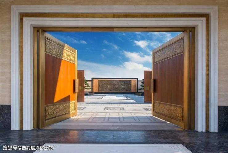 宽约19米的尊崇府门,极具大家门风,细节雕琢又不失江南细致风雅。门头顶部的深褐色铝板包边,木纹洞石的柱子,真铜包裹的对开大门,方正硬朗的雕花把手,皇家御用汉白玉、恭王府样式、曲阳大师手笔打造抱鼓石......
