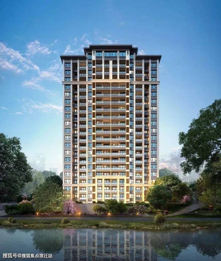高层建筑外立面以米黄色为主,配以褐色铝板及中式回纹元素,中而不古,新而不洋。