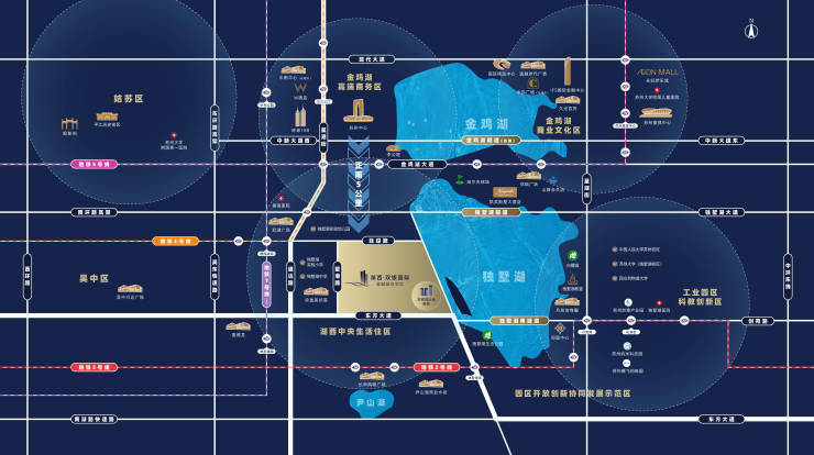 高端生活圈:双湖交汇处,尽享城芯繁华。4公里范围左右,汇聚了李公堤、金鸡湖高尔夫俱乐部、凯宾斯基大酒店、月亮湾国际中心等高端商业/生态配套。15分钟可到达苏州中心、W酒店、山姆会员店等大型高端商区,尽享双湖繁华。