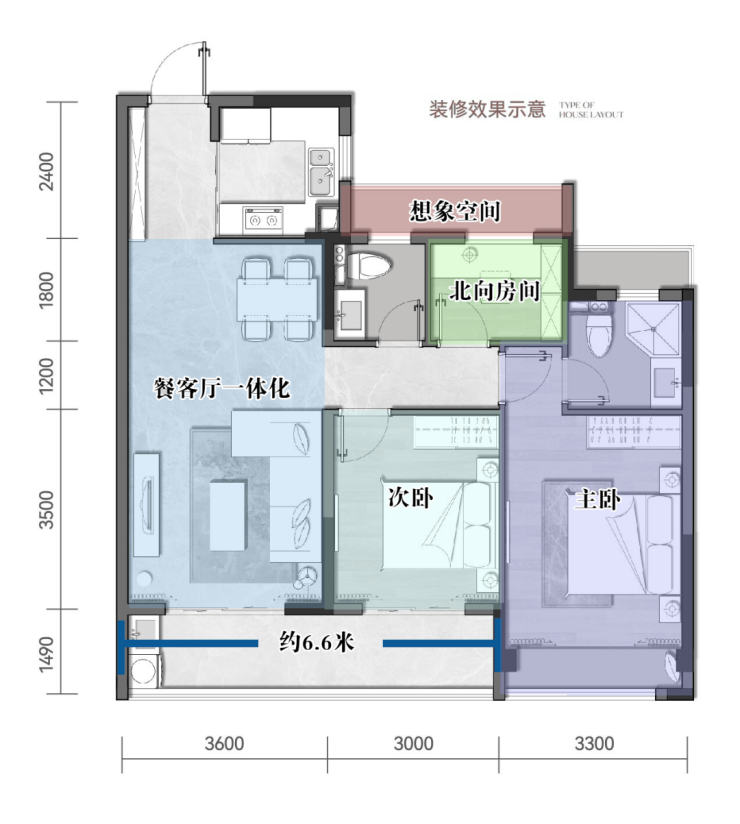 东面连接约7米阔绰阳台,套房式主卧,带飘窗、衣帽间和卫生间,全面覆盖男女主人的生活所需。周末坐在飘窗上看书喝茶,累了就靠枕小憩,还可设计为收纳的地方,为空间扩容。