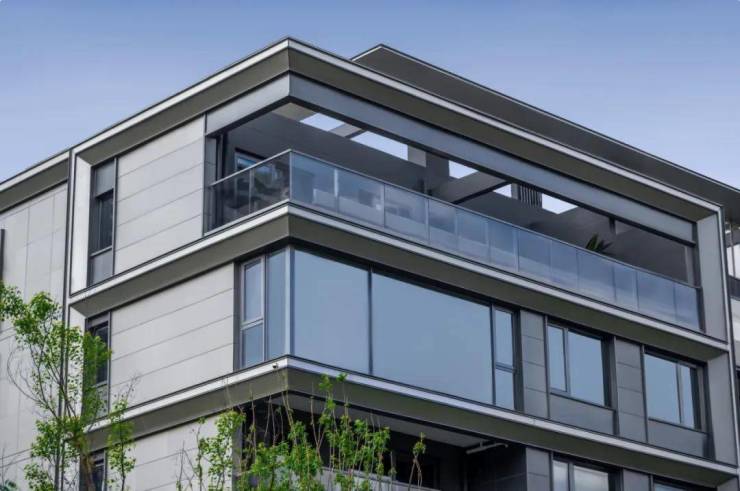 以江南绿意勾画建筑的底色,融合大面灰色铝板立面,横向勾勒铝板线条及超宽屏的采光面,实现超高南向窗墙比和超阔观景视野,与内外风景相得益彰,兼具当代审美与属地特色,让建筑与艺术相互成就。