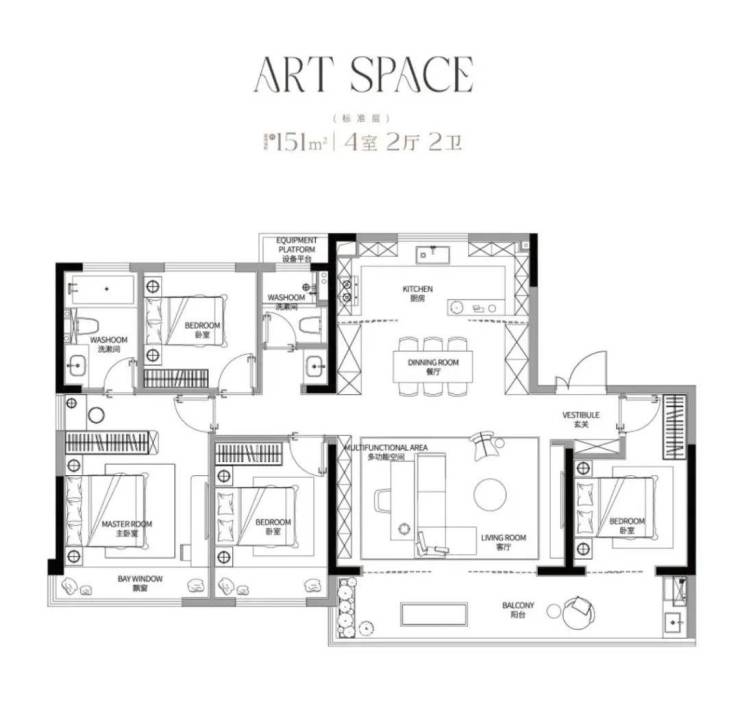 建面约151㎡四房两厅两卫户型,相较于建面约128㎡户型更大的面积,意味着居住舒适度会更高。五开间朝南,约16米南向面宽,约9.1米阔景阳台,超气派餐客厅一体化设计,方寸之间设计感与尊崇感尽显,这个户型的每一项亮点拎出来在同面积段户型中都是王炸级的存在。