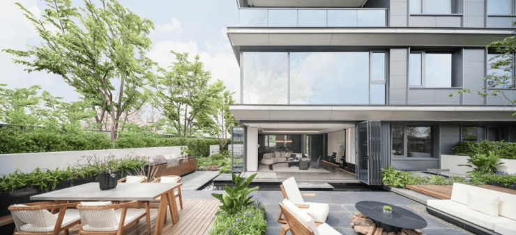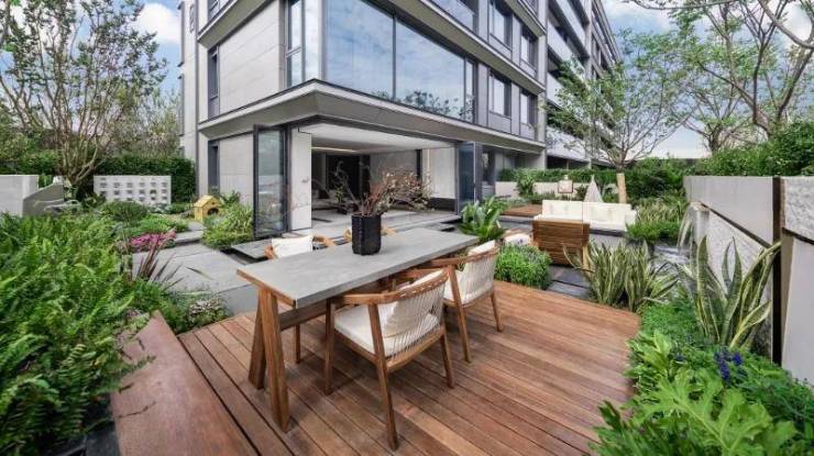 纯叠墅地块为容积率仅约1.24的臻稀低密墅境,亲地建筑与六大自然园境是亲密联结的,在植物与光影的编织中,让人沉浸在院落自然的怀抱里。