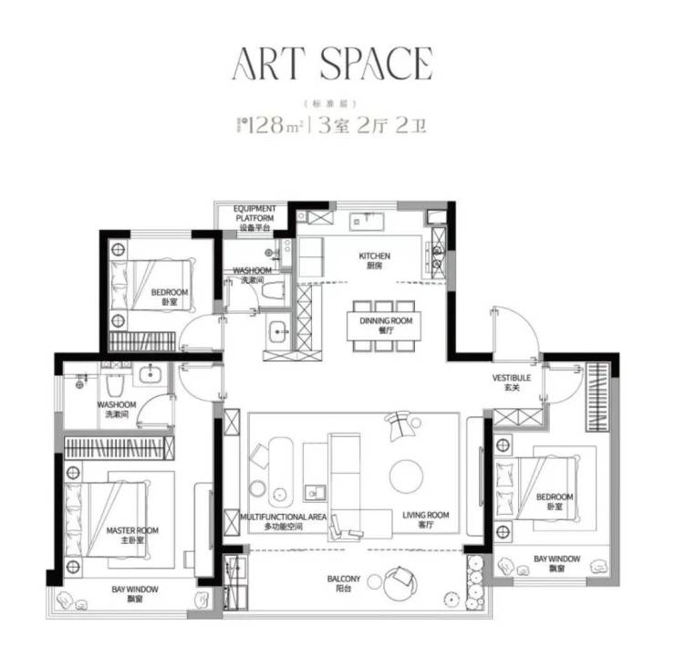 建面约128㎡三房两厅两卫户型,设计师将客厅、餐厅及厨房全都融为一体,做了开放性的布局,四开间朝南,约6.6米开间的宽厅连通阳台,南北通透,保证了充足的采光。主卧套房设计,满足高端人群对居住空间的挑剔需求。双卫设计,更具隐私性,规避了一房三代同堂的困扰。