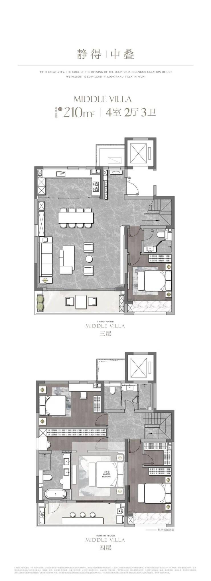 下叠【院隐】户型建面约310㎡,4室2厅4卫的三层院墅,地上六开间朝南,地下约5.2米挑高空间打造近100㎡私人会所;一楼超大南向度假式庭院与客厅相通,近50㎡全龄社交会客厅,采光视野媲美大平层。