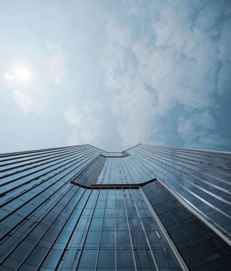 建筑立面以两个简洁体量交错咬合,形成一道深邃的内凹折线,不仅在形态上与建筑轮廓相呼应,更在不同时间与视角下,呈现出丰富的光影变化与形象剪影,在高楼林立的核心区中脱颖而出。建筑立面以纵向铝板装饰条搭配Low-E玻璃,构成简洁而富有节奏的基本语言,在体量咬合处巧妙转化为横向线条,形成鲜明的视觉反差。