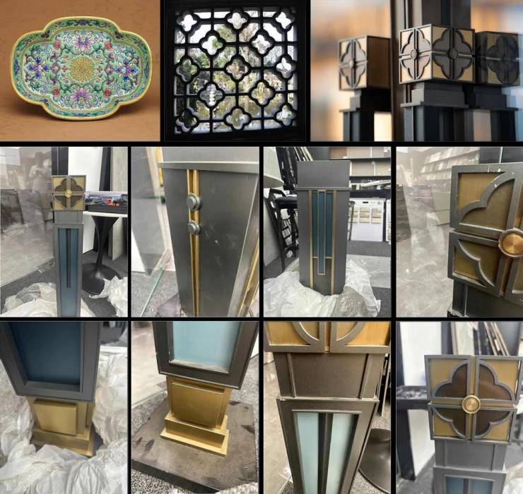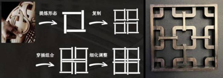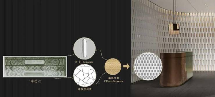 套方锦纹有四方形、十字、八角等图案,代表形正心正,寓意正直、吉祥。我们抽象提炼以现代几何体块穿插建构,有序中正,选材以回纹金属的厚重与夹丝玻璃的轻盈对比。