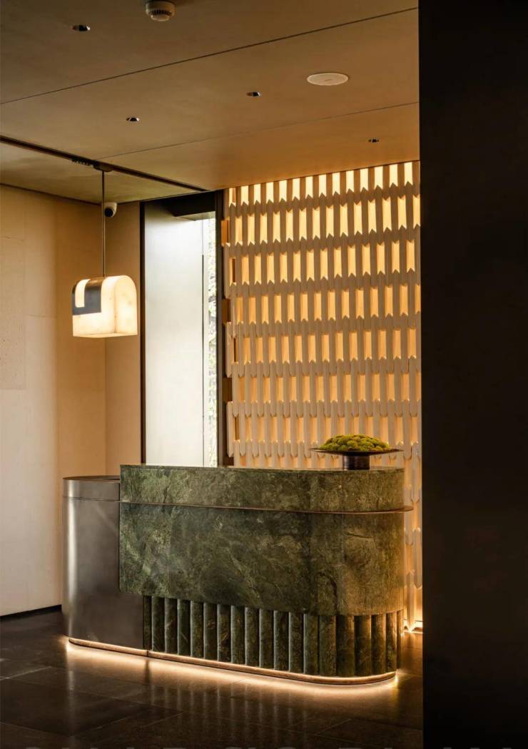 古人言“宅以门户为冠带”,门是一种礼仪制度的象征,更是宅第品格修养的表现。海上瑧悦,单元门头整体和小区入口大堂呼应,两侧采用大象灰石材哑光面和拉槽面,门头金属条纹的细密程度拿捏地恰到好处,在细节和光影设计上做了整体东方格调的把控,层次细腻、典雅大方。