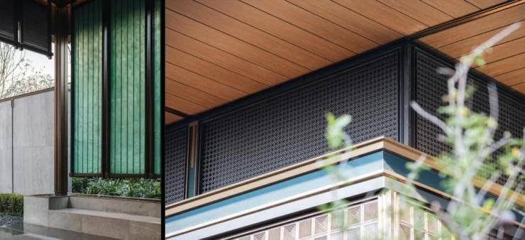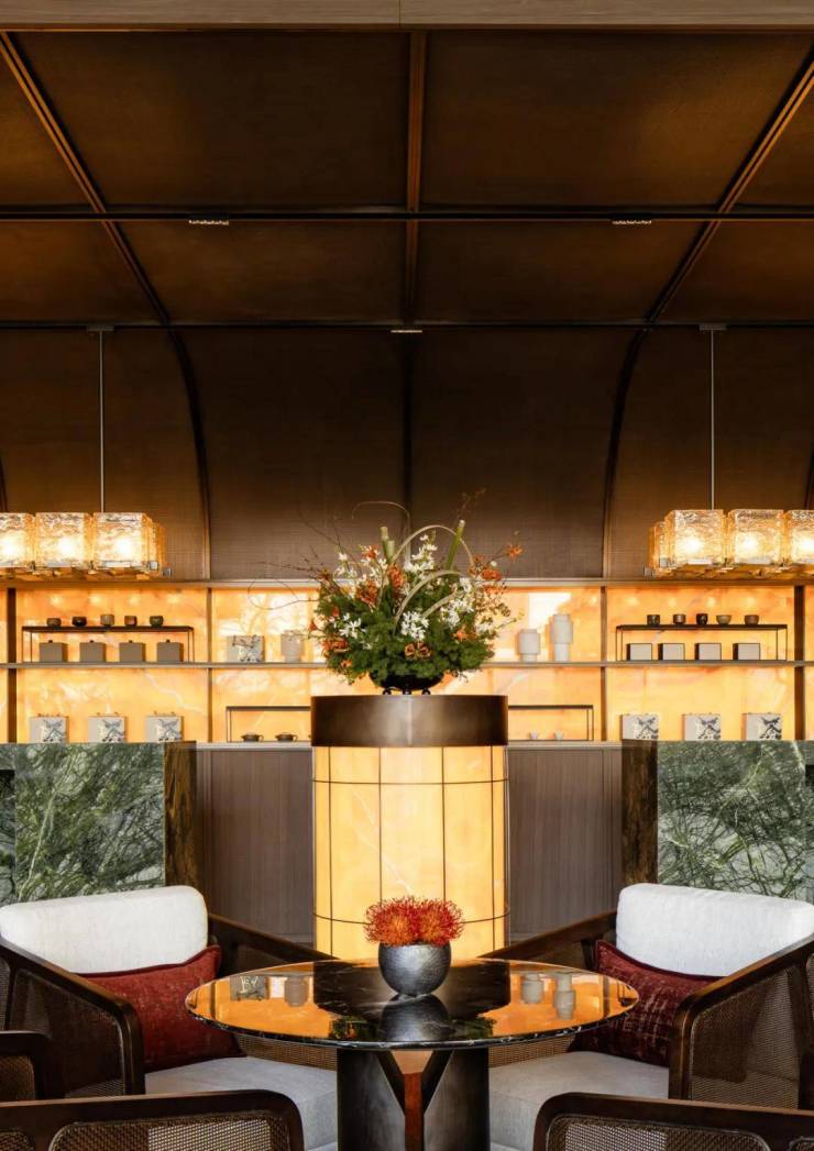 “山欲高,尽出之则不高;烟霞锁其腰则高矣。水欲远,尽出之则不远;掩映断其脉则远矣。”国人讲究含蓄、朦胧之美,丹枫水院将山水美景置于框中,是为框景;琉璃水院,浮光廊两侧,是为对景;将冬青、乌桕,橄榄绿、菲油果、铁冬青等近百种植物以及山石、瀑布叠水引入园中,是为借景;透过套方锦纹花格屏风窥见园中景色,是为漏景;黑山石、蟒水纹金属贴片朦胧之下,让人觉得意犹未尽,是为障景。海上瑧悦运用多种组景手法,一山一水,一花一木,步移景异,无不体现层次之美,动态之美。