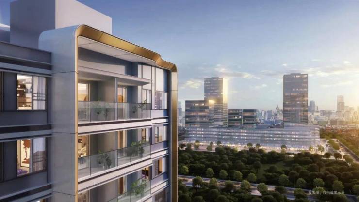 高层屋顶采用精炼中式挑格线条充分融合东方传统生活意趣和现代艺术审美哲思登览之顷,心旷神怡,远吞山光,平把江漱帆墙烟树,历历在目,凭栏遥瞩,诚为壮观。出挑阳台线条,暗合龙华塔层层香善线条龙华塔是上海现存历史最为古老的佛塔。
