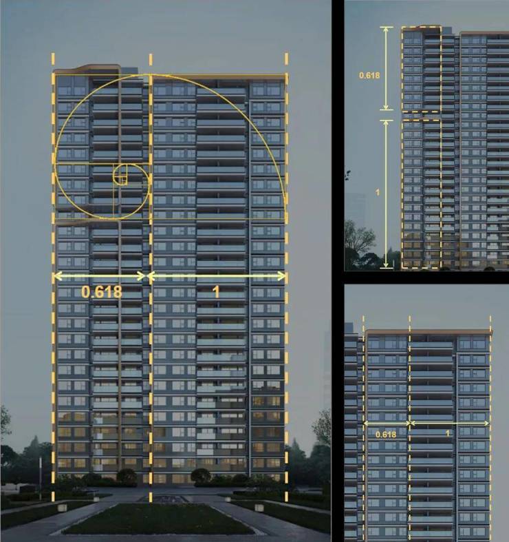 塔楼设计,提取圆润的玉造型和白金的配色。“金镶玉”使建筑立面变得更为柔美,圆弧铝合金转角线条,形态上暗合珠圆玉润的传统美学意韵,代表一种温和雅丽尊贵典雅的审美价值取向。从文化内涵角度,圆弧图形寓意圆融通达,顺遂平安,体现一定的传统文化内涵。立面上中下三段式黄金分割比例,具有严格的比例性、艺术性、和谐性,蕴藏着丰富的美学价值。