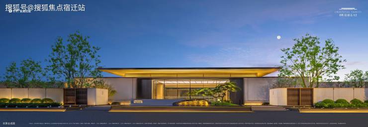 尊崇礼仪门堂,约40米宽重工门头,再现中式府邸门庭风度;楼栋建筑采用江南飞檐的技法,勾勒屋檐舒展平远的姿态;镂空金属、木纹铝板、错缝石材拼接,演绎山水纹理,隽永美好。