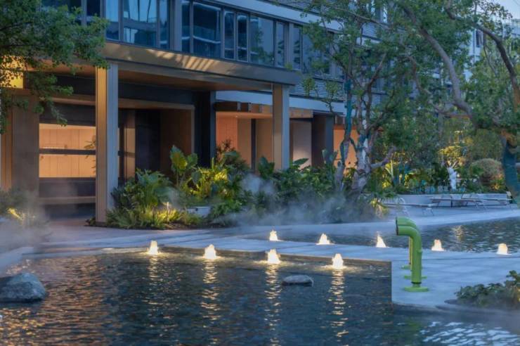 奇幻的水瀑森林、松弛感拉满的度假泳池、孩童嬉闹的戏水池、mini植物园般的种子乐园等,沿着中轴一路铺展开来。