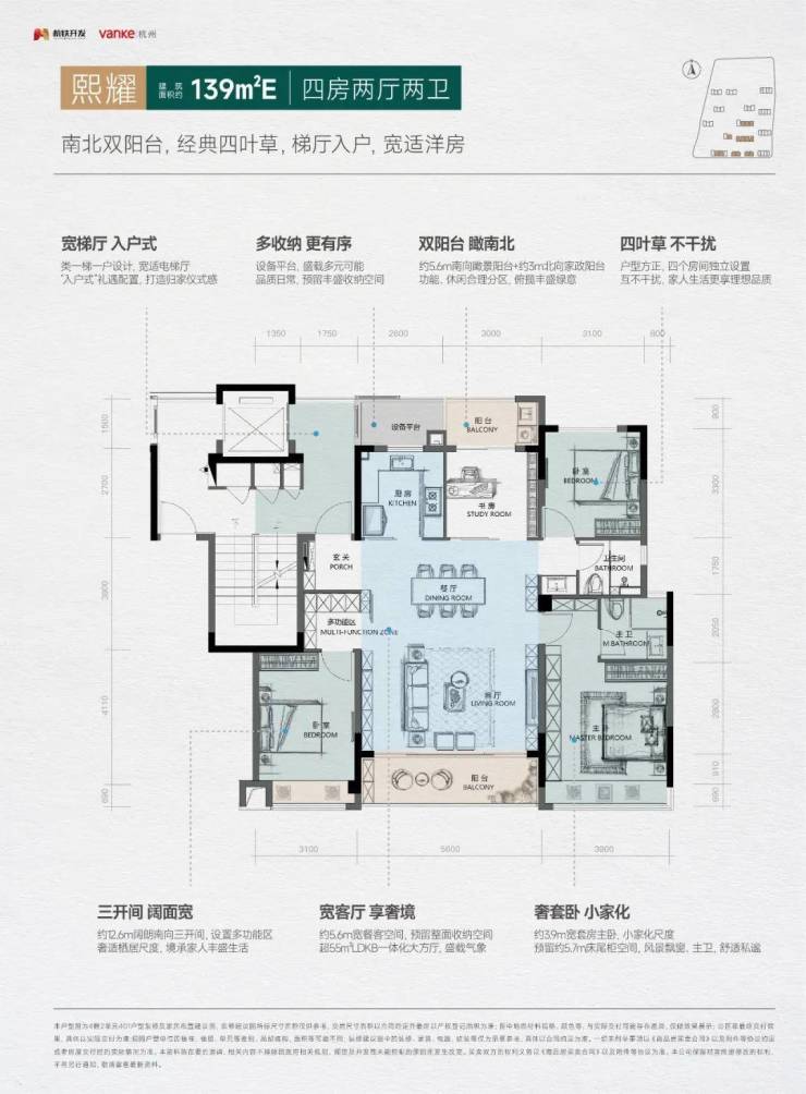 改善家庭可以选择建面约139㎡户型“一步到位”,该户型更加接近传统“四叶草”格局,整体为双套房设计。