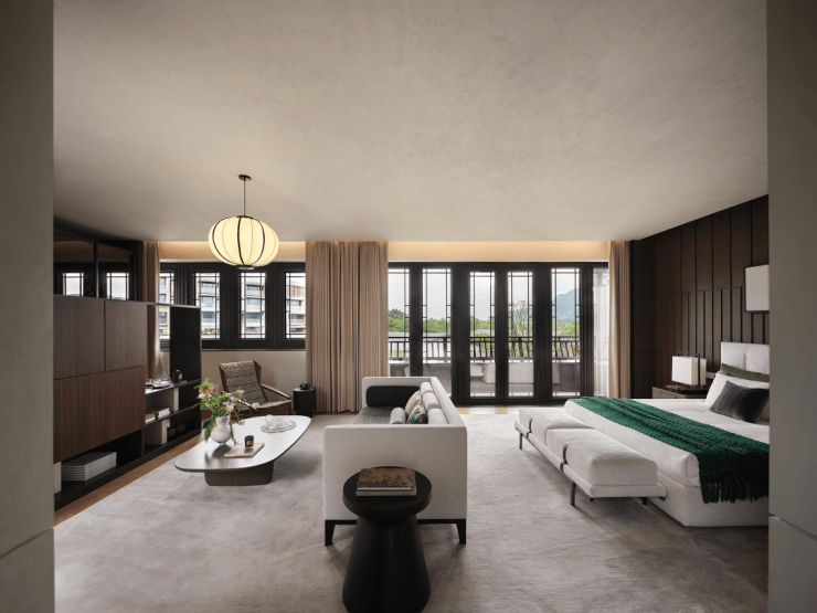 从大环境看,在约10平方公里的湘湖,这里恰好位于酒店最密集、气质最“森系”的一段。湖山天境距湖岸最近仅约100米,出门就是湘湖二期核心区,绿道、船埠、茶楼一路连缀。它落于一座蓊郁山谷,山间涓涓流下的一条溪水,在项目内汇成一潭中心湖——正是山峙水洄的风水宝地。
