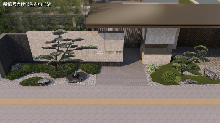 同时大门配有水钵,黑松,这样的搭配不仅视觉上效果更好,也能中和掉材料本身的冷感。