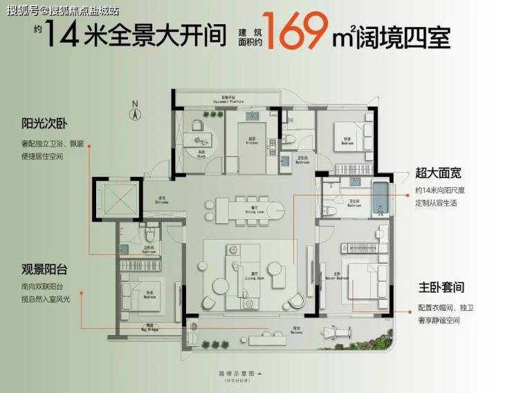敞阔的楼间距,搭配上城芯难得的大户型,更大程度地增加了全天光照时间与瞰景视野。约129㎡阔景洋房拥有约10.7米南向阳台,充分迎接阳光的照射,造就阳光明媚、健康温馨的生活;约169㎡大平层则享受约14米的全景面宽,推窗即刻拥有IMAX级的观景视野,尽揽园林美景,生活自此赏心悦目。