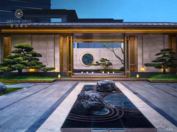 入户两侧水景清泉涌动,婉转迂回,一座精致的宋风美学馆展示在眼前。透过门框衬映出满月景墙,甄选名贵奢石,在虚实掩映间延续着东方诗意山水的写意画卷。