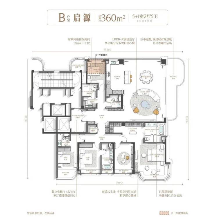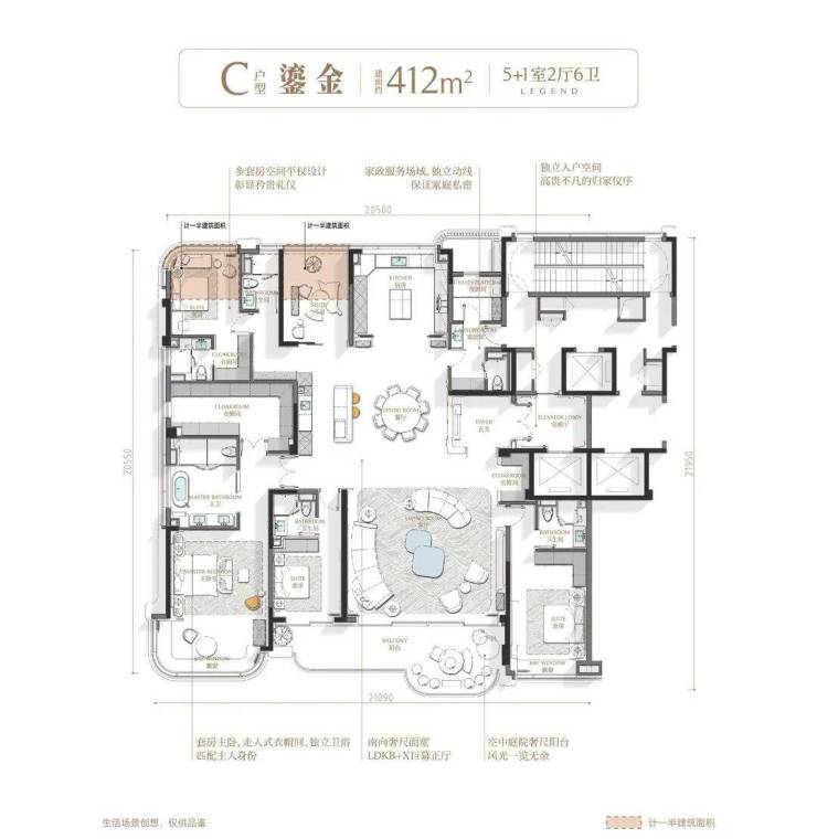 高层大平层(356/360/416/496㎡):3.5米极致层高,远超市面标准;南向开间20米起步,四面宽/五面宽朝南,全明通透;一梯一户独立私梯入户,搭配专属保姆梯+保姆套房;主卧行政套房设计,配备独立衣帽间、双台盆卫浴与观景浴缸;大方厅横厅布局,南北通透双阳台,其中花园舱阳台进深约3.8米,实现类第四代住宅空中庭院体验;496㎡楼王占据中心景观王座,直面翡翠之环与无边泳池,全景视野拉满。
