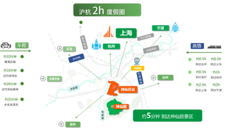 神仙花谷,2024年6月杭温高铁开通后,约40分钟即可抵达杭州,约80分钟到达上海,神仙生活的人间样板