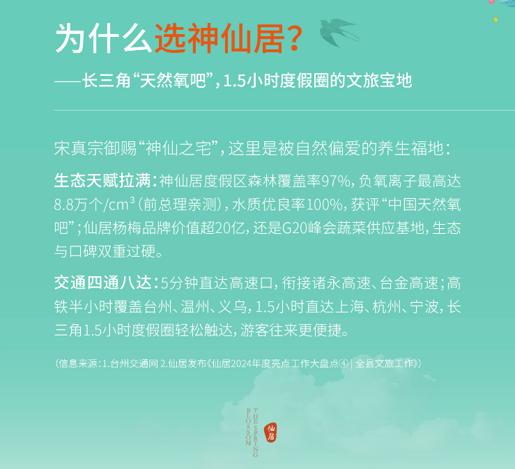 体验场景:5A级神仙居景区、韦羌溪、原始黑松林、800亩(53万㎡)花乐园、桃李春风社区等
