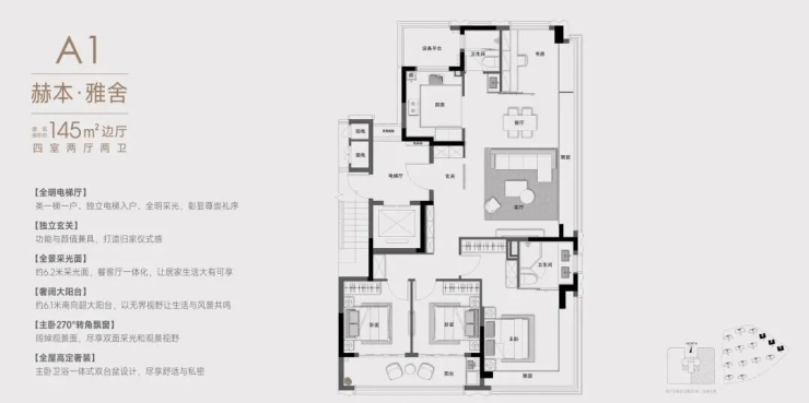 建面约145㎡的户型:项目采用创新的"两梯两户"设计,通过巧妙的空间规划实现类一梯一户的尊享体验。双电梯厅以防火门分隔,确保住户私密性。专属电梯直达户门,10平方米的270度转角入户花园,兼具采光通风优势,将功能性与仪式感完美结合。