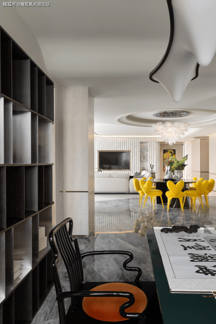 约300㎡“观湖”,谢柯打造;另一款是更宽舒的约412㎡“行云”,出自邱德光。尤其是约412㎡“行云”,无论玄关处雪花白、劳伦黑金、金世纪的大胆拼花,瓦楞式的波浪形电视背景墙,还是吸睛的普拉达绿石材吧台,全屋随处可见出色审美和奢华材质的完美结合。