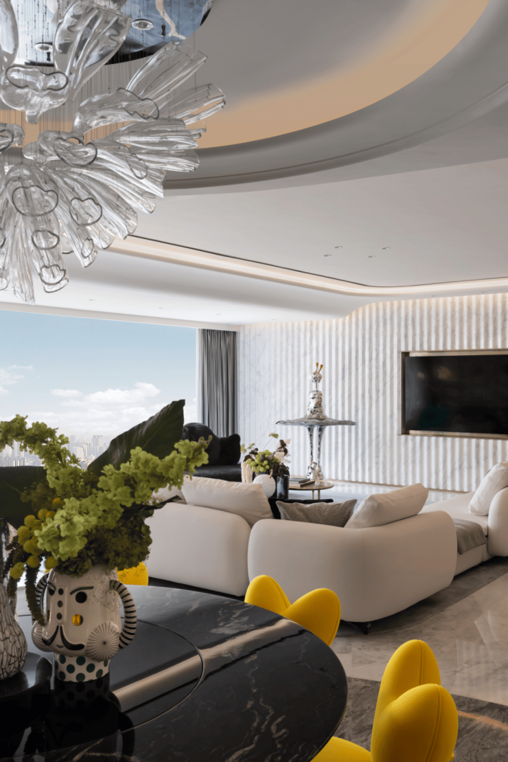 客厅背景墙融入水波流动般的曲面造型,转角处的圆弧处理,室内材质的对比呈现,大理石材的多样纹理、艺术家具的色彩碰撞,运用梦幻、艺术、时尚元素,共同延续新装饰主义NEO ART DECO精神。