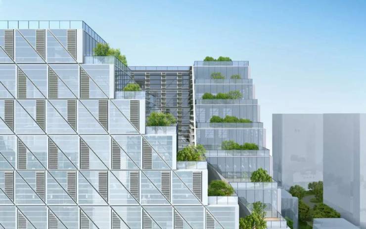 这个名叫西溪深蓝的项目,就像阳光下大写的白日梦,刻写在西湖区,呈现为一座巨大的“X”型,层层退台如空中梯田,又如乐高积木。