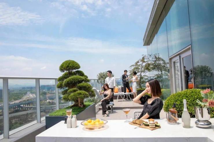 西溪深蓝建筑面积约85㎡,层高约4.75米的云端叠院,面宽约12.6米,露台面积约45㎡。