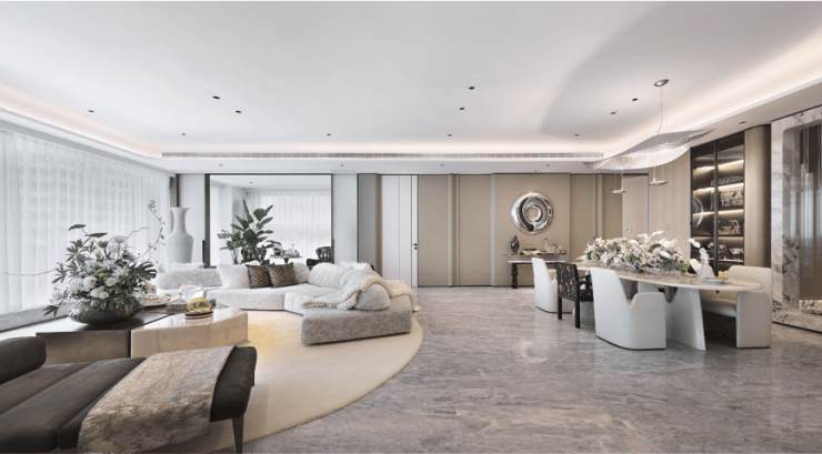 整体设计风格以浅白色为主,客厅背景墙贴着大面积「芬迪白大理石」,弧形的造型配合木饰面,以及酒店级的灯光设计,让整个空间看起来奢华又不失温馨。