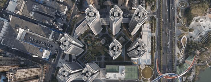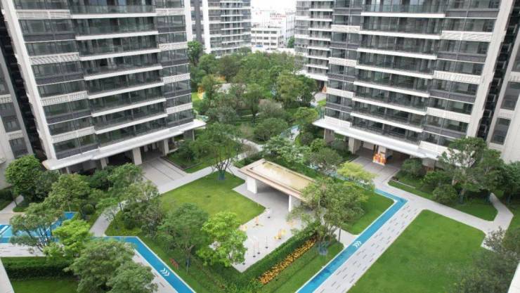 跟着小飞机视角,可以看到园林基本做完,树木葱郁、错落有致。