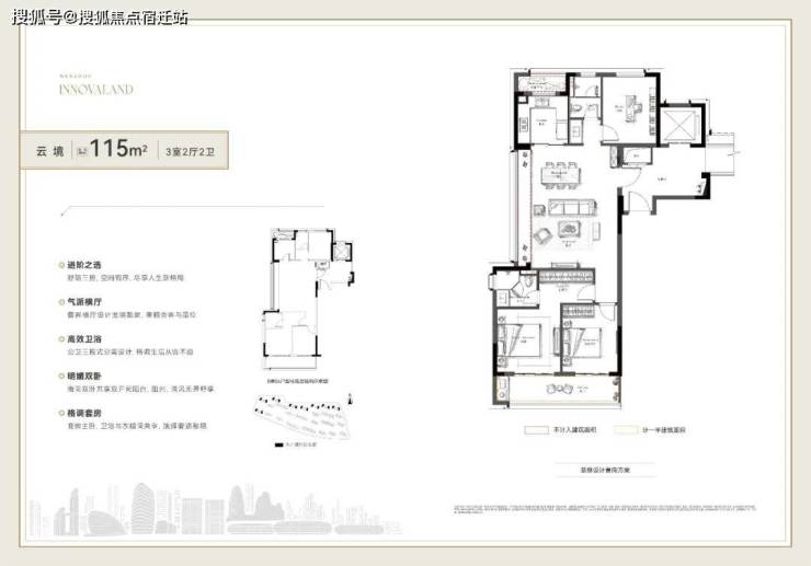 而建面约115㎡云境,同样是3室格局,却非常有“个性”。最大亮点在于气派餐客横厅设计全景大飘窗,兼顾会客与品位、景观,是目前很多豪宅项目的固有CP。公卫三段式分离设计、南向双卧共享双开间阳台等,让空间有序,尽享人生新格局。