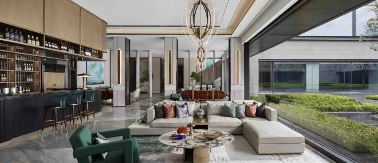 从室外的庭院部分的“山西黑”石材开始,到了室内,奢石的用料、渗透的更加极致。