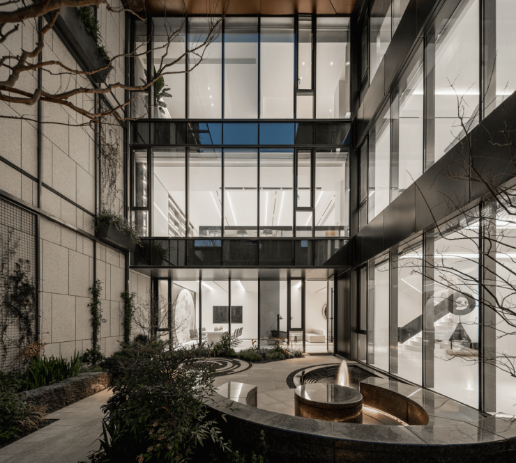 各层空间根据使用层级进行垂直分配:地下一层为挑高6.6米的会所展厅,可满足接待、展示、休闲等复合需求;地面一层设有接待门厅与会议空间;二至三层作为企业办公区,高管与员工办公空间可相对独立;最上层则为企业主自用的生活起居区,真正实现“上居下办”,让工作与生活自然过渡。