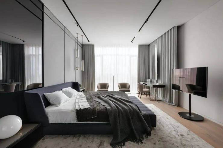 主卧空间不多矫饰,以现代主义的高度理性,减少陈设的构成元素,于现代极简主义中流露出简约之美,保持冷静和理性,直观地洞见到美与奢适的统一性。