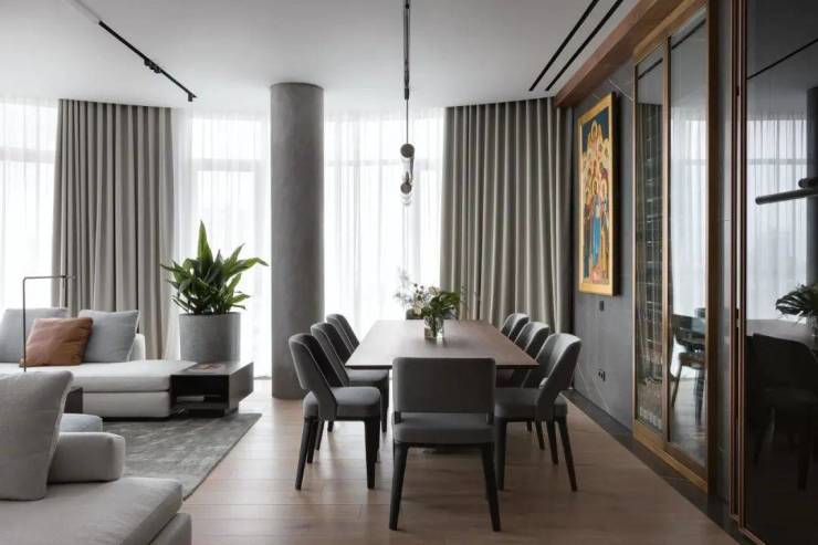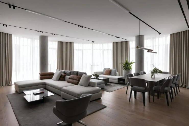 由设计师Artur Sharf,Artem Zverev,Alesia Riamova,Anya Tarabanova,Gleb Brizhanov共同设计,客厅以灰白色为主,与金属材质搭配,加入工业风元素,使得格调满满的,纯粹而惊艳。