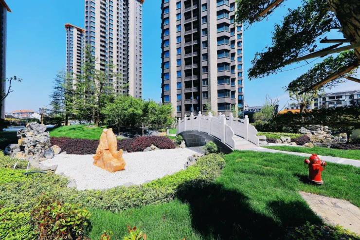 社区外部沿街绿化景观,有多重花坛组成,搭配大小灌木和香樟等多种数木。还配备中央景观层叠式瀑布、景观休闲步道、儿童娱乐设施等等;