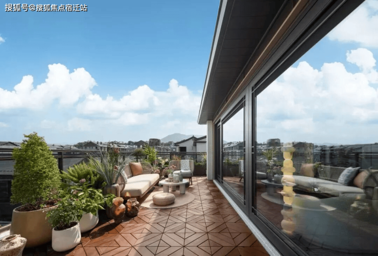 而溪映听庐的上叠,也有空间非常阔绰的阳台+露台,清晨站在露台上,直面群山的翠绿和4000个/立方米的负氧离子。